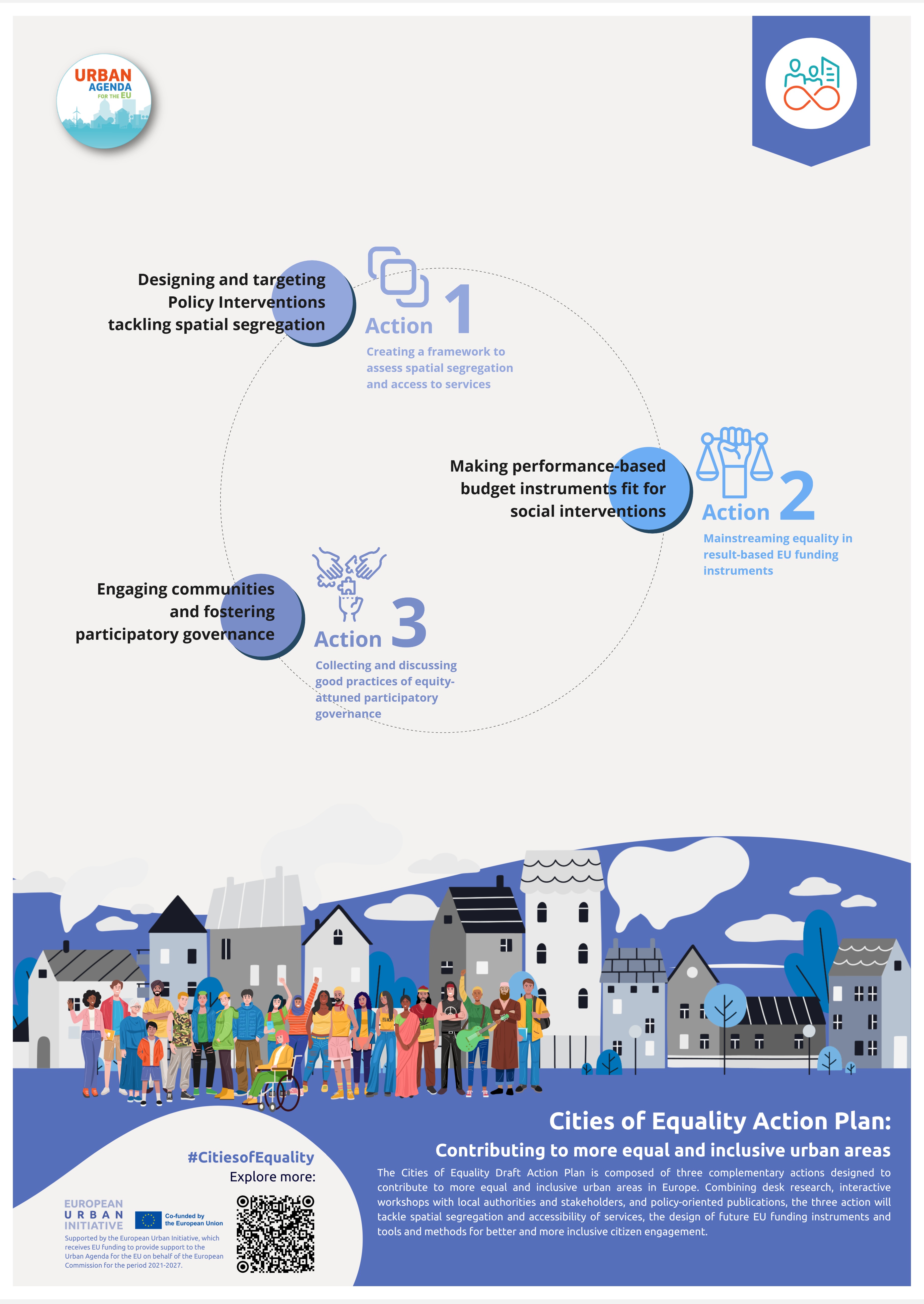 The Cities of Equality Action Plan brings together national authorities, European institutions, metropolitan areas, municipalities and urban networks to deliver three complementary Actions that aim to strengthen equality in urban policies and practices. The Actions reflect a common ambition: to ensure that no one is left behind in the design, implementation and evaluation of urban policies.