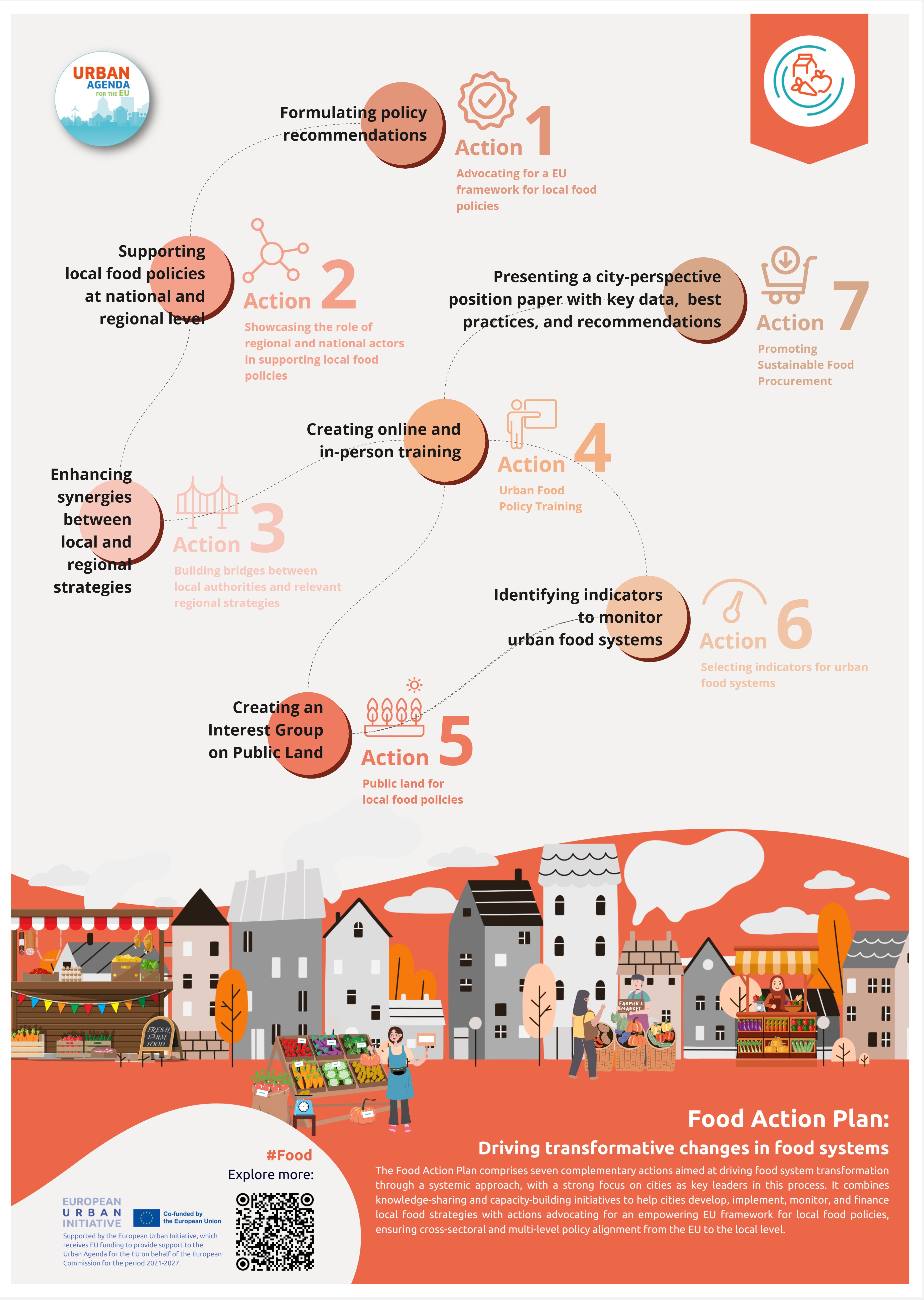 The Food Action Plan takes a systemic approach to transforming food systems, emphasising the role of cities as leaders through innovative urban food policies. It includes both advocacy efforts to strengthen cities’ voices in EU food governance, and knowledge-sharing and capacity-building initiatives to support cities in developing, implementing, monitoring, and financing local food strategies.